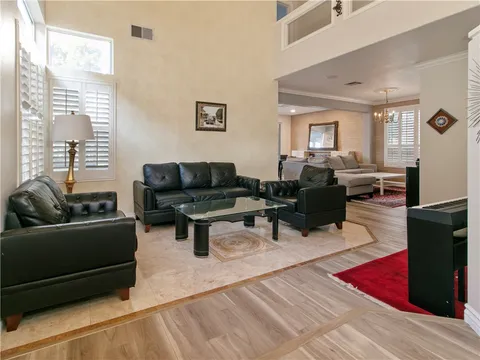 Welcome to The Highlands in Anaheim Hills! Tucked away on a quiet street, this spacious 4-bedroom, 3-bathroom home with a large office offers one of the best floor plans and view lots in the neighborhood. From its vaulted-ceiling entry to its expansive canyon and mountain vistas - snowcapped peaks in the winter - this home combines comfort, potential, and an unbeatable location. Inside, the thoughtful layout features a formal living room with surround sound speakers, a dining area with custom cabinetry, and a cozy family room with a fireplace and direct access to the backyard. The kitchen stands out with granite counters, custom cabinetry, skylights, and upgraded stainless steel appliances. Just off the living room is a large custom office with built-in storage and wood cabinetry. Upstairs, all bedrooms are conveniently located, including a primary suite with a private balcony showcasing spectacular views and excellent potential for future closet and bathroom expansion. Two additional bedrooms share a dual-sink bathroom with separate enclosed shower and toilet area for added privacy., ideal for functionality and convenience. The backyard is designed for entertaining with recently upgraded concrete, custom landscape lighting, a built-in BBQ, large fire pit, and a scenic viewing deck to take in city lights and sunsets. Additional highlights include real wood flooring upstairs and on the stairs, luxury vinyl flooring over tile, updated HVAC (5-7 years), newer water heater (2 years), skylights, custom window shades, ample garage storage, and a separate washer/dryer area. Perfectly situated near award-winning schools (Canyon Rim Elementary, Canyon High, and Running Springs Elementary), parks, hiking/biking trails, shopping, dining, and with easy access to the 91, 55, 71, and 241 freeways, this property offers exceptional value in one of Anaheim Hills' most sought-after communities. With its generous square footage, incredible views, and prime location, this home is ready for its next owner to make it their own. Don't miss the opportunity!