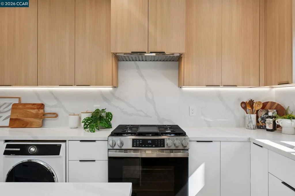 This stunning Berkeley bungalow in the heart of the city has been thoughtfully taken down to the studs and completely reimagined, blending a strong, well-built structure with beautifully curated modern designer upgrades throughout. Designed for modern comfort, the home features new insulation, updated plumbing and electrical systems, and brand-new central heating and air conditioning. A charming layout welcomes you with a dynamic roofline and soaring ceilings that create a bright, open, and inviting atmosphere. The thoughtfully designed floor plan offers two bedrooms and two bathrooms, along with two outdoor deck spaces and a sun-drenched backyard, ideal for embracing Berkeley's indoor-outdoor lifestyle. At the heart of the home, the skylit kitchen serves as a true chef's retreat, showcasing sleek two-tone European-style cabinetry with warm wood accents, a striking waterfall quartz island, and under-cabinet lighting that enhances both function and style. Ideally situated in a phenomenal central location near San Pablo Park, Berkeley Bowl, BART, and major highways, offering easy access to shopping, recreation, commuting, and everyday conveniences.