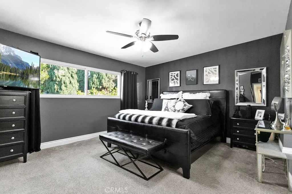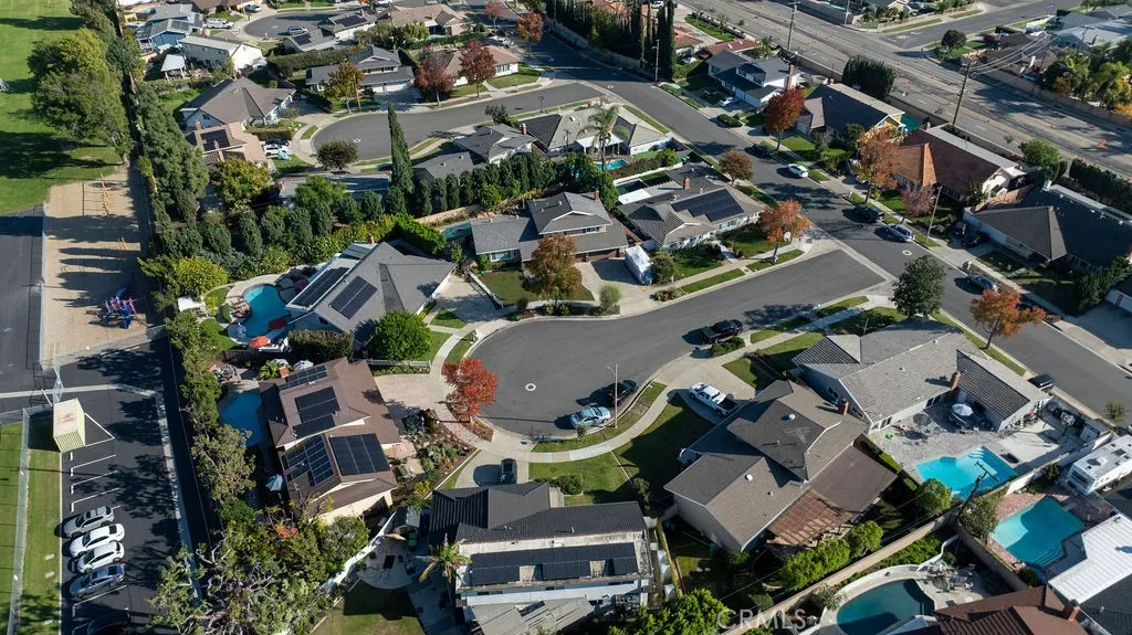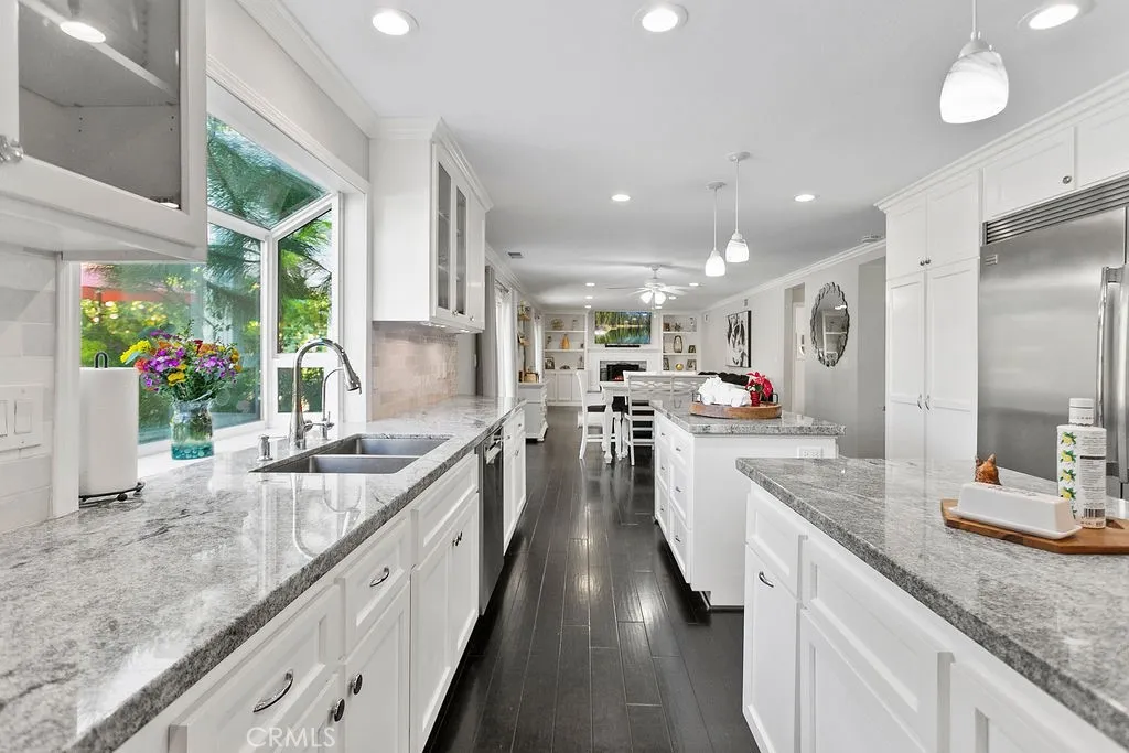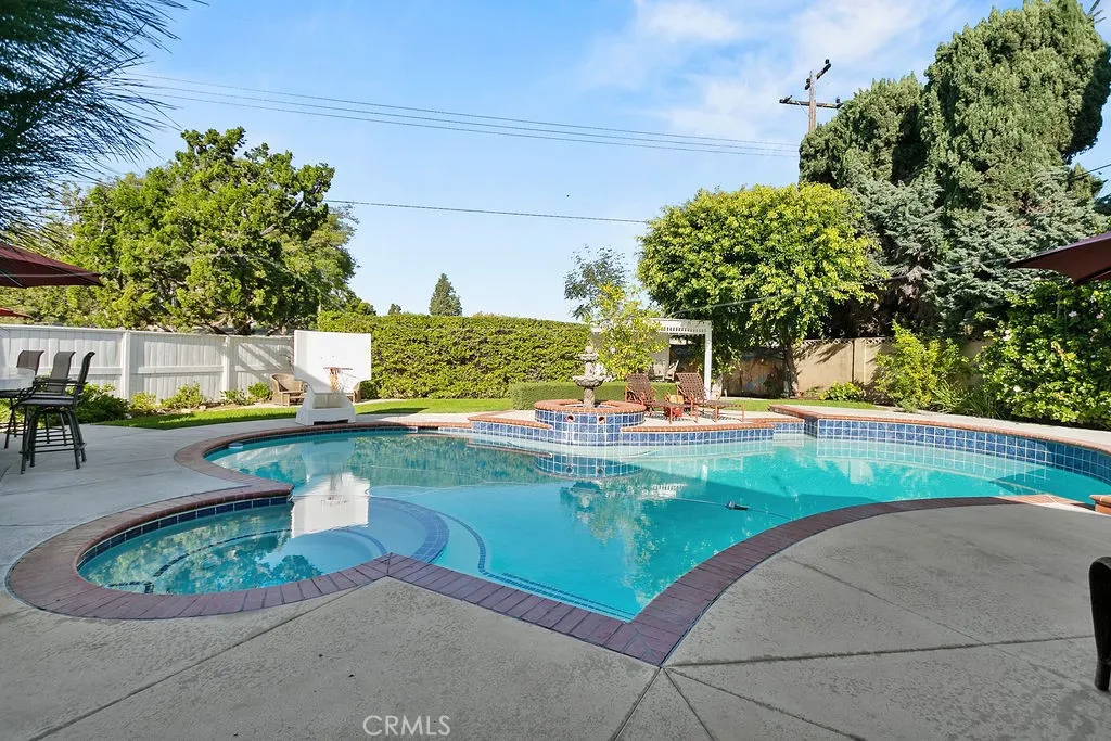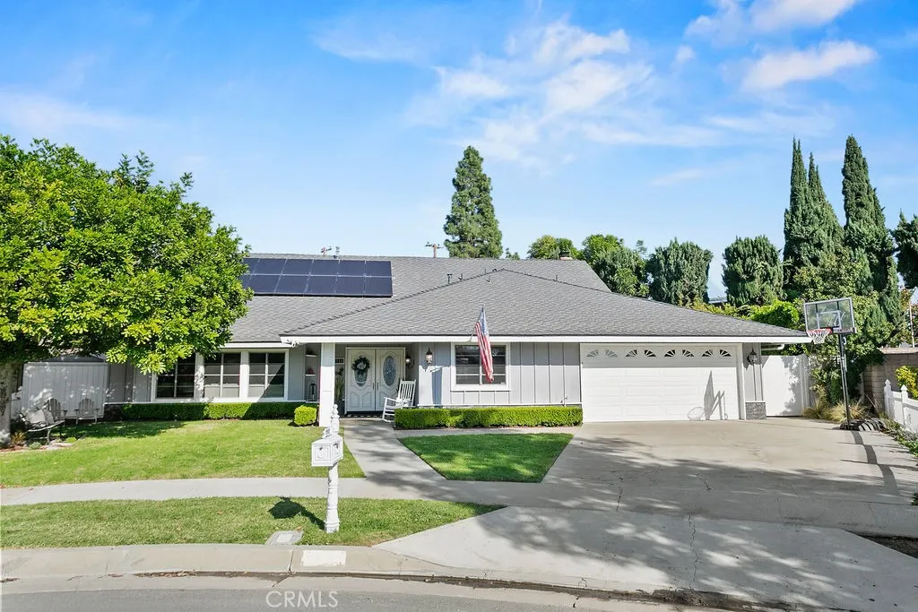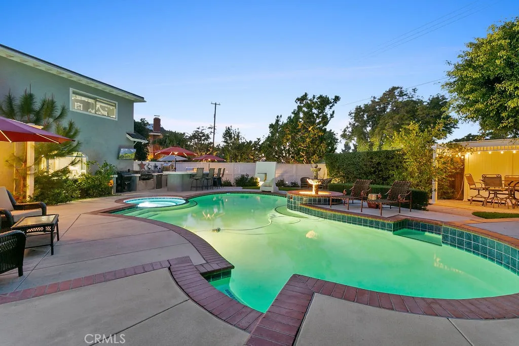 Located on a quiet and tranquil cul-de-sac, this elegantly crafted estate is exploding with upgrades. Situated on an expansive 10,000 square foot lot, and boasting almost 2900 square feet of living space, this masterpiece is the perfect blend of luxury living and outdoor charm. Enter through double glass inlaid front doors into a light bright entry. Dark wood floors and custom base and case give the entry an open and inviting feel. The kitchen is laid out in open concept with the spacious family room for that perfect great room feel. High end SS appliances, double island, glass inlaid uppers, two sinks (prep and main), and scenic picture window of the resort like back yard make this kitchen the benchmark for culinary excellence. The family room is spacious, and rear loaded with multiple access points to the backyard, giving the home a true California indoor outdoor feel. Built in custom cabinetry and stone fireplace surround give the family room a warm and inviting feel while also maintaining an opulent and design conscious feel. The formal living room is sprawling with room for 10 top dining, and plenty of room for full formal sitting set up. A huge picture window bay provides tons of natural light a a perfect view of the quiet cul-de-sac. The primary bedroom is spacious and elegantly finished with dark walls contrasting neatly with crisp base and case. The open primary bath is finished with dual vanities, walk in shower, large soaking tub, seamless glass enclosure, rain head and wand shower, and private water closet. The secondary bedrooms are elegantly appointed with spacious layouts, upgraded base, ceiling fans, floating shelves, and large windows for plenty of natural light. And possibly the crown jewel of the property is the sprawling resort like back yard, complete with covered patio, sparkling pool and spa, built in outdoor kitchen w/ SS pizza oven, BBQ, and giant bar top seating peninsula. The sprawling patio has plenty of space for full outdoor dining AND lounge area for those big game days and nights. Other great features include spacious finished garage, downstairs bedroom w/ bathroom proximity, solar panels, recessed cans, separate indoor laundry room, fully renovated secondary baths, grassy area, fountain water feature, and spacious driveway with extra parking space. Call for additional details!