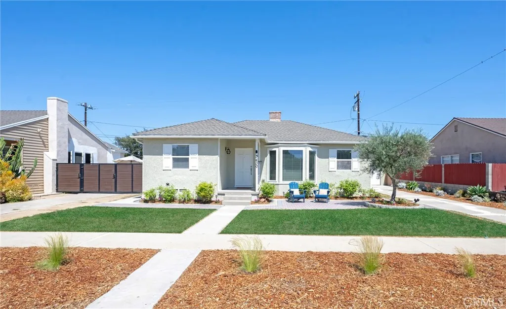 Welcome to this beautifully appointed 3-bed plus office, 2-bath residence at 3430 Clark Ave in Long Beach, offering an enviable front view of the Sky Links Golf Course. Step through a beautifully landscaped front yard accented with pavers to a welcoming front porch. The spacious living room immediately impresses with its crown molding, a cozy fireplace featuring a brick hearth and mantle, and elegant single-plank wood flooring. The dining room, seamlessly flowing from the living space, boasts a large window with blinds, crown molding, a new light fixture, and surround sound, all set on single-plank wood flooring. The kitchen has been fully remodeled, designed for both beauty and function. It features pristine quartz countertops, a stylish subway tile backsplash, stainless steel appliances, custom cabinetry with new hardware, recessed lighting, and tile flooring with the added luxury of in-floor heating. There is also a convenient walk-in pantry that provides ample storage. Adjacent to the kitchen is a dedicated dining area, with a new chandelier and single-plank hardwood floors. The primary bedroom is a true spacious retreat, highlighted by a beamed ceiling, laminate flooring, a charming brick hearth and fireplace, a generous walk-in closet, a wall heater, and a slider offering direct access to the backyard. The primary bathroom has been beautifully updated with new tile flooring, a new vanity featuring stone countertops, custom cabinetry, and modern fixtures. For ultimate convenience, the laundry facilities are located within the primary bedroom suite. Bedrooms two and three offer comfort with a ceiling fan and light, as well as single-plank wood flooring, along with a practical walk-in closet. Bathroom two is elegantly updated with tile flooring, stone counters, and custom vanity, cabinetry, and fixtures, complete with a tub/shower combo. This home has been meticulously maintained and upgraded, with significant enhancements including newer insulation, updated windows, and recent interior/exterior paint. The home is equipped with an HVAC system and replaced ducting. Step outside to a private backyard oasis, beautifully finished with pavers and benefiting from yard sprinklers in both the front and back. The property also features rain gutters and partial copper plumbing. A two-car detached garage offers epoxy flooring and a dedicated office with laminate flooring. Enjoy an extended driveway for additional parking. Welcome to this charming, gorgeous home.