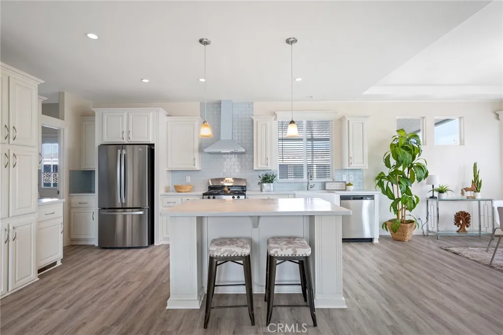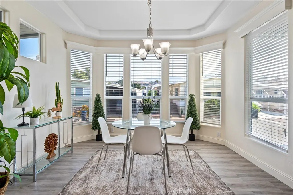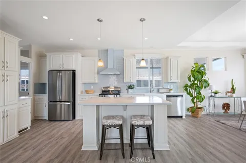 Take a look inside this beautiful, brand-new LUXURY Manufactured Home located in the prestigious Twin Oaks Senior 55+ community in La Verne, California. This Top of the Line Pacifica Model features 9 foot tall Ceilings with coffered detailing in living and dining rooms, Double Pane 80 Inch tall Windows throughout, luxury 100% waterproof laminate Flooring throughout, 8 Ft Tall Interior Doors, recessed lights in main living areas, and Wood Mini Blinds throughout. The open gourmet kitchen welcomes you with an expansive center island/breakfast bar seating highlighted with pendant lighting, Stainless Steel appliances of fridge, stove, dishwasher, trash pull out cabinet, roomy farm house sink and finished off with Tile Backsplash to the ceiling. A separate laundry with washer and dry hook ups offers extra storage space as well as access to the outside. Relax in the large master bedroom complete with high windows with roomy ensuite with shower, private separate toilet room, and double sinks. Additional two large guest bedrooms have mirrored wardrobe slider doors and hallway bath featuring tub and shower combo. One of the big highlights is the exterior of home featuring custom 6'x14'Front Porch Entry with Trex Flooring & Steps, 6'x22' Wrap Around Porch with Flat Panel Awning, Wood Rails & 6' Wide Steps leading to side patio. Other exterior features 3 foot rear block wall, artificial turf, custom walk way with pavers, finished concrete side patio, drip system and custom 10'x10' Hardi Board Double Door Storage Shed. This is a delightful home anyone would love to come home to. Don't miss out!