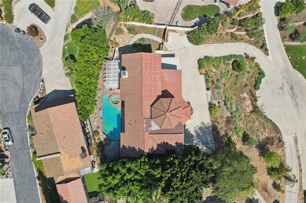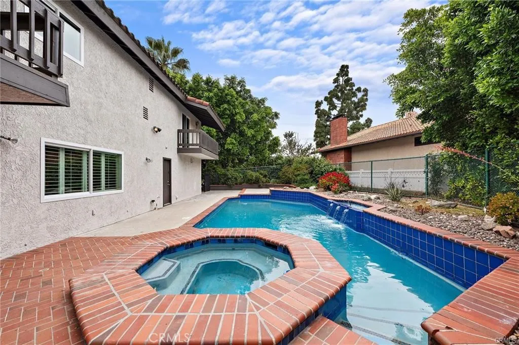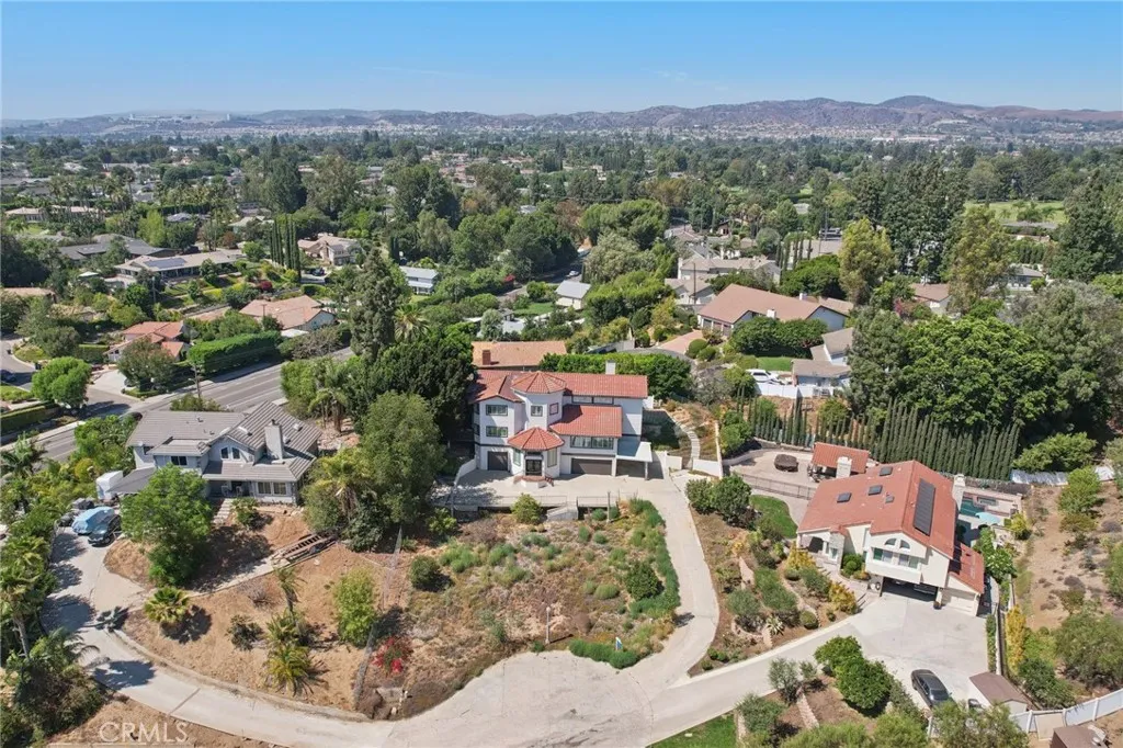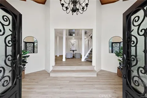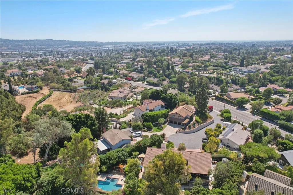 Experience the perfect blend of privacy, elegance, and luxury in this turn key, one-of-a-kind Yorba Linda estate, tucked away at the end of a peaceful cul-de-sac on a private road shared with only three neighbors. A long, dramatic driveway leads to a grand foyer with a sweeping three-story spiral staircase, setting the tone for the sophisticated living spaces that follow. The open, light-filled layout is perfect for entertaining, featuring a spacious living room with vaulted ceilings, a formal dining room bathed in natural light, and an expansive entertainment room complete with a wet bar, mini-fridge, wine storage, fireplace, and space for gatherings of any size. The gourmet kitchen offers recessed lighting, floor-to-ceiling cabinetry, abundant counter space, and a walk-in pantry, with a breakfast nook and family room opening to an elevated deck ideal for dining under the stars. The luxurious primary suite features vaulted ceilings, a private balcony, fireplace, spa-inspired bath, and two oversized walk-in closets. Additional bedrooms share balconies and a Jack-and-Jill bath. Parking and storage are exceptional with an oversized two-car garage with built-ins, a second oversized garage with half bath and tall ceilings for larger vehicles, plus a covered carport. The backyard is a private retreat with a pool, spa, fountain, and elevated deck, complemented by a large hobby room for creative projects. Set on a half-acre hill with mountain views, mature trees, and fruit trees, this rare property offers the ultimate in seclusion while being just minutes from Imperial Highway and the 91 Freeway - an incredible opportunity to own your estate in one of Yorba Linda's most desirable locations.