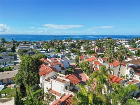 Experience ocean and sunset views from the moment you arrive at this beautifully updated 3-bedroom, 3-bath La Jolla residence, offering 2,032 sq. ft. of thoughtfully designed space and an exceptional indoor outdoor lifestyle. Tucked in a peaceful cul-de-sac within one of La Jolla's most coveted neighborhoods, the home features three balconies including a private rooftop deck with sunset views along with additional ocean views from two balconies and the spacious primary suite. The main level includes a highly desirable downstairs bedroom and full bath, while the upgraded kitchen showcases stainless steel appliances, a double oven, and a five-burner cooktop. The living and dining rooms open through elegant French doors, enhancing natural light and creating a seamless flow to the outdoor spaces. Wood floors, new carpet, ceiling fans in bedrooms, and refreshed lighting add a warm, modern touch throughout. This property stands out as the only home in the community with a spacious private yard, offering a rare outdoor retreat ideal for relaxing, entertaining, or enjoying the coastal breeze. Perfectly positioned near the ocean, Bird Rock, and the vibrant La Jolla Village, this home blends comfort, convenience, and timeless coastal charm. With a generous primary suite and multiple outdoor spaces including the stunning rooftop deck showcasing sweeping sunset views this residence delivers a truly exceptional La Jolla living experience