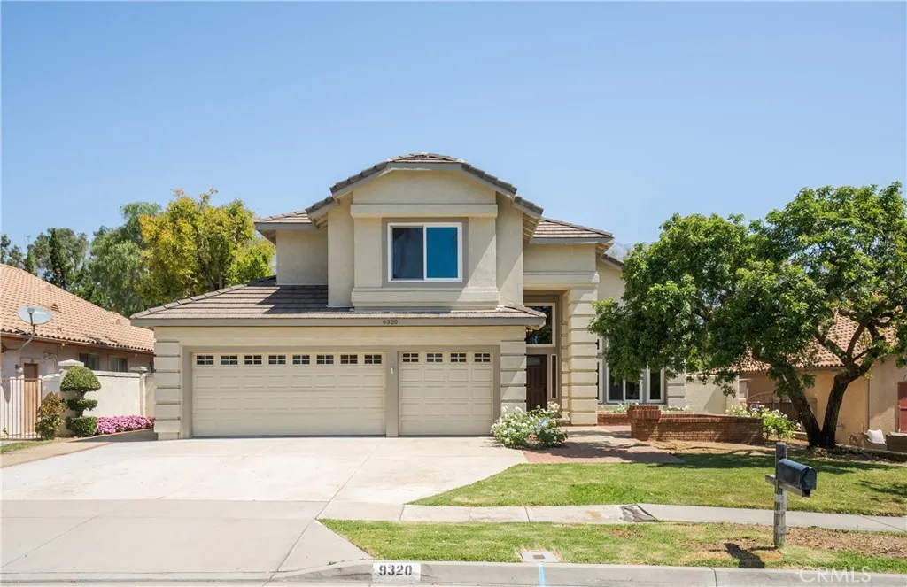 Located in the desirable Heritage Estates community of North Rancho Cucamonga, this beautifully maintained 4-bedroom, 3-bath home offers a functional layout, tasteful updates, and excellent curb appeal - all in a quiet, established neighborhood. The first floor features a bedroom and full bath, perfect for guests, multigenerational living, or a home office. Upon entry, you're welcomed by travertine tile flooring that leads into a spacious formal living and dining area with soaring ceilings and abundant natural light. The large, updated kitchen features warm, inviting tones, generous cabinet space, and a casual dining nook. It opens to a cozy family room with a charming tiled fireplace. French doors lead to the private backyard with a grassy lawn and a peaceful, lightly elevated view of the foothills. Upstairs you'll find three additional spacious bedrooms. The oversized primary suite includes room for a sitting area, home office, or fitness space, plus an en suite bathroom and private balcony - perfect for enjoying your morning coffee or unwinding in the evening. Additional highlights include updated wood flooring, new carpet upstairs, custom window shades, an indoor laundry room, and a three-car garage. As a bonus, this was the original model home when the community was built in 1992, showcasing thoughtful design and extra touches throughout. The inviting brick front porch adds the final charm to this move-in-ready home.