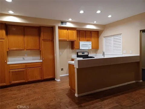 This two-story condo features one shared wall and is situated within a gated community. The property encompasses 2045 square feet, with 3 bedrooms and 2.5 bathrooms. Amenities include a community pool, an attached 2-car garage with direct access, and high ceilings. The first floor boasts a laundry room, storage space under the stairs, a half bathroom, tile flooring, a living room, dining room with carpet, a family room with a fireplace, a kitchen with ample cabinet space, a breakfast area, and a private backyard with trees. The upper level features carpeted flooring, a den, a bathroom with dual sinks and a shower over the tub, two additional bedrooms, and a master suite complete with a walk-in closet and a balcony.