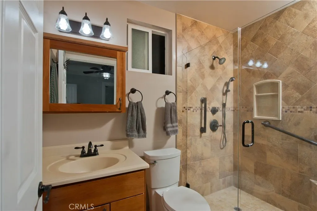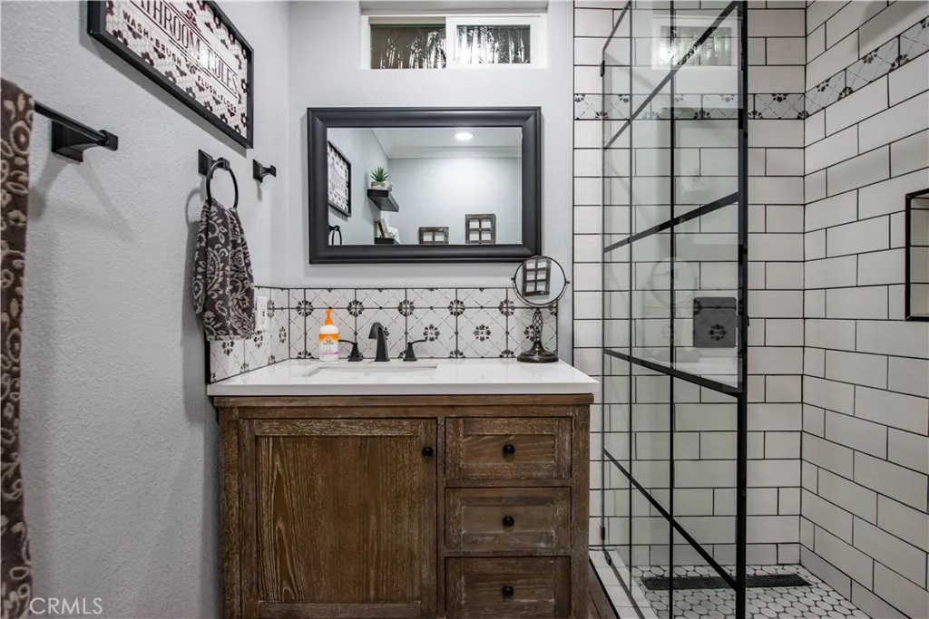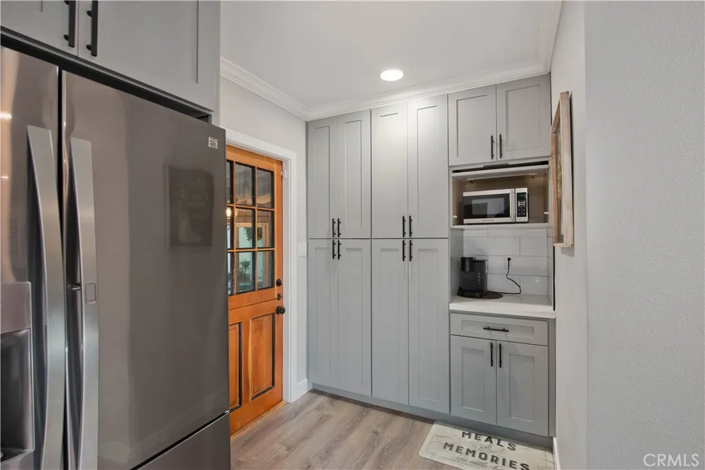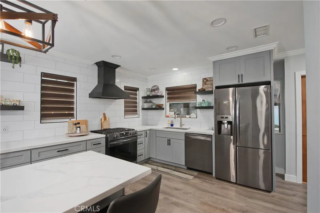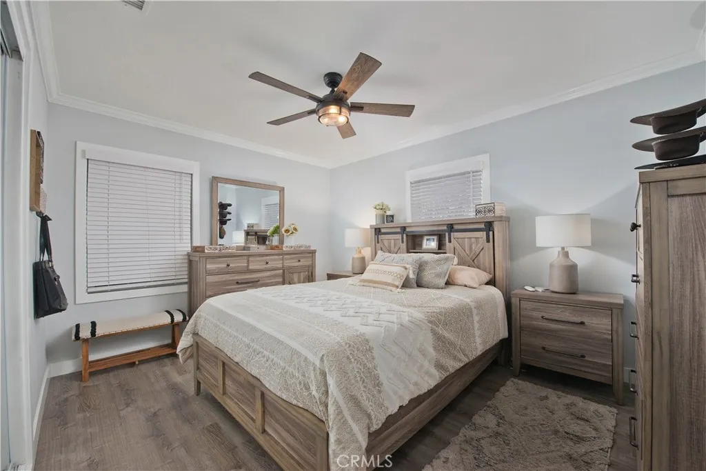 Welcome to this beautifully renovated single-story home located in Long Beach's highly desirable South of Conant neighborhood. Offering a total of 1,644 sq.ft. of living space, this property includes a thoughtfully upgraded main home, a versatile enclosed patio, and a garage converted into a fully functional studio.The main home offers 969 sq.ft. with 2 bedrooms and 2 bathrooms. From the moment you arrive, you'll be charmed by the home's inviting curb appeal, complete with a front porch, fresh exterior paint, newer windows and fascia board and beautifully landscaped front and back yards. A brand-new roof installed in 2025, updated gutters and downspouts, and a steel-framed driveway gate add to the home's durability and peace of mind. For year-round ambiance, the decorative lighting system, operated via wifi, illuminates both the front and back of the home. Inside, a warm and inviting interior highlighted by newer luxury vinyl flooring throughout, crown molding, high baseboards, recessed lighting, and plantation shutters. A cozy fireplace with a barnwood beam mantle anchors the living area. The custom kitchen is a true showstopper with a large center island, quartz countertops, subway tile backsplash, stainless steel appliances, modern cabinetry with pots-and-pan drawers, and a pantry with a built-in coffee station. The hallway bathroom is thoughtfully updated with a modern farmhouse-industrial style, decorative tile accents, and a sleek vanity, while one bedroom enjoys a private en-suite bath. Energy-efficient features include solar panels, newer tankless water heater, newer insulation, and a cool roof attic fan. Central heating and air conditioning ensure year-round comfort. The 315 sq.ft. enclosed patio expands the living space with accordion glass walls, shiplap accents, a modern fireplace heater, ceiling fans, and its own AC/heat split system - perfect for year-round enjoyment. The garage has been converted into a 360 sq.ft. studio complete with a bathroom, kitchenette with custom cabinetry, its own AC/heat split system, and dedicated laundry - ideal for guests, a private workspace, or rental potential. Step outside to your private backyard retreat with two pergolas, a covered patio, and a sparkling pebble tec pool and spa. Set on a tree-lined street close to shopping, dining, schools, and Long Beach Airport - with the beach and 405 freeway just minutes away - this home combines modern amenities, energy efficiency, and flexible living spaces.